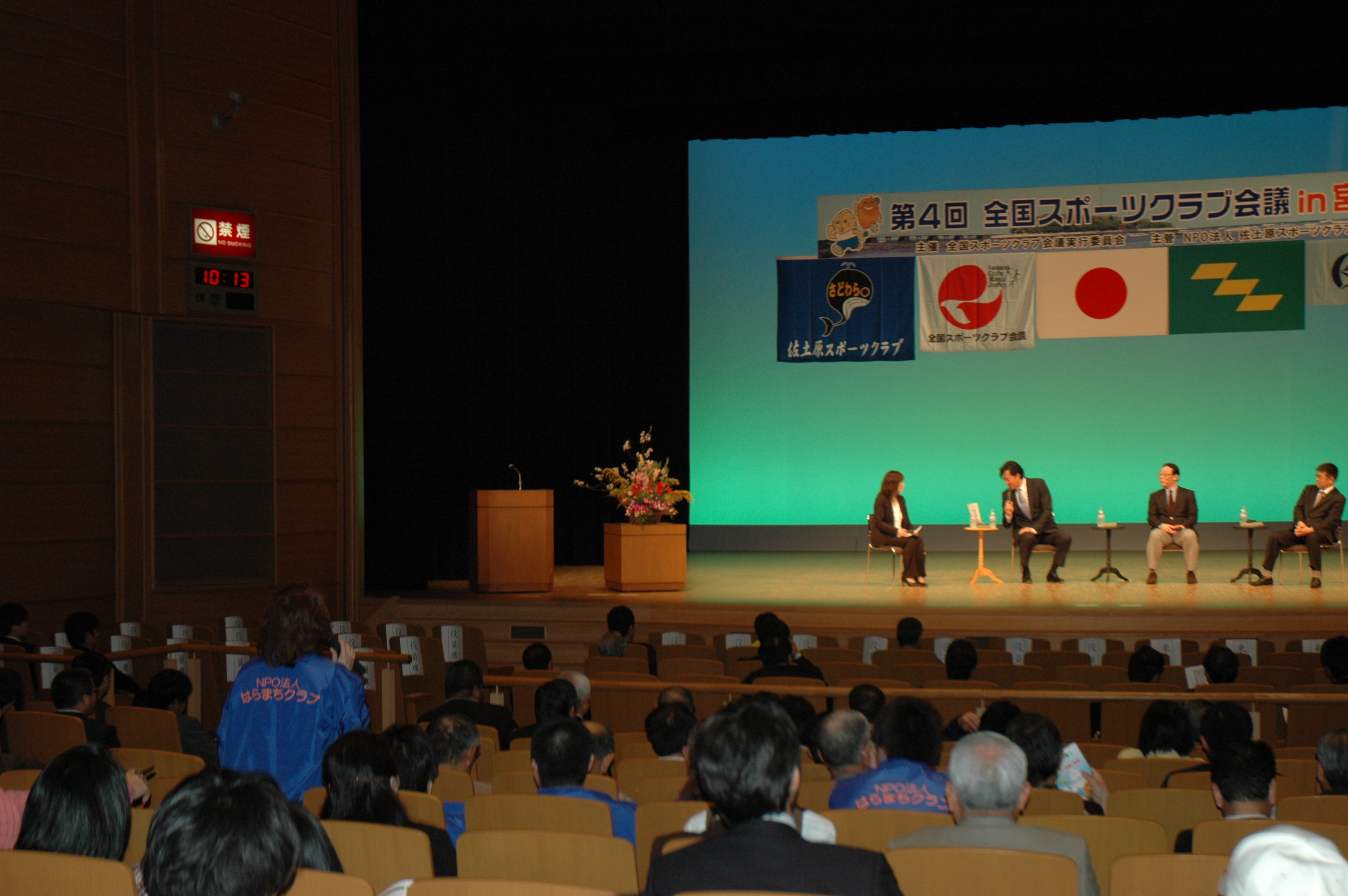 平成23年2月に開催された「第4回全国スポーツクラブ会議in宮崎」の際、パネラーの元バレーボール日本代表川合俊一さんにチラシを渡し、「今度、ビーチバレー大会を主催するので、エールをお願いします」と発言されている、福島県南相馬市にある「NPO法人はらまちクラブ」の理事長江本節子さん。(手前青いジャケット着用の女性)