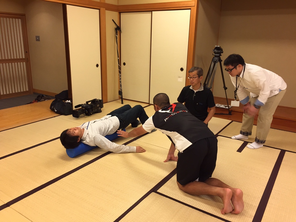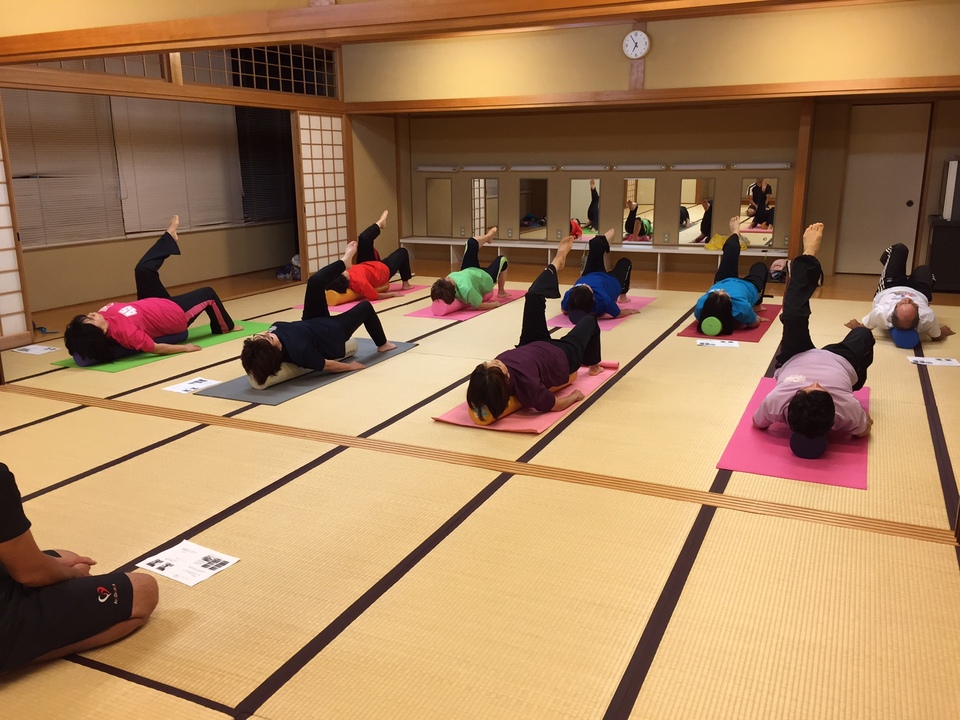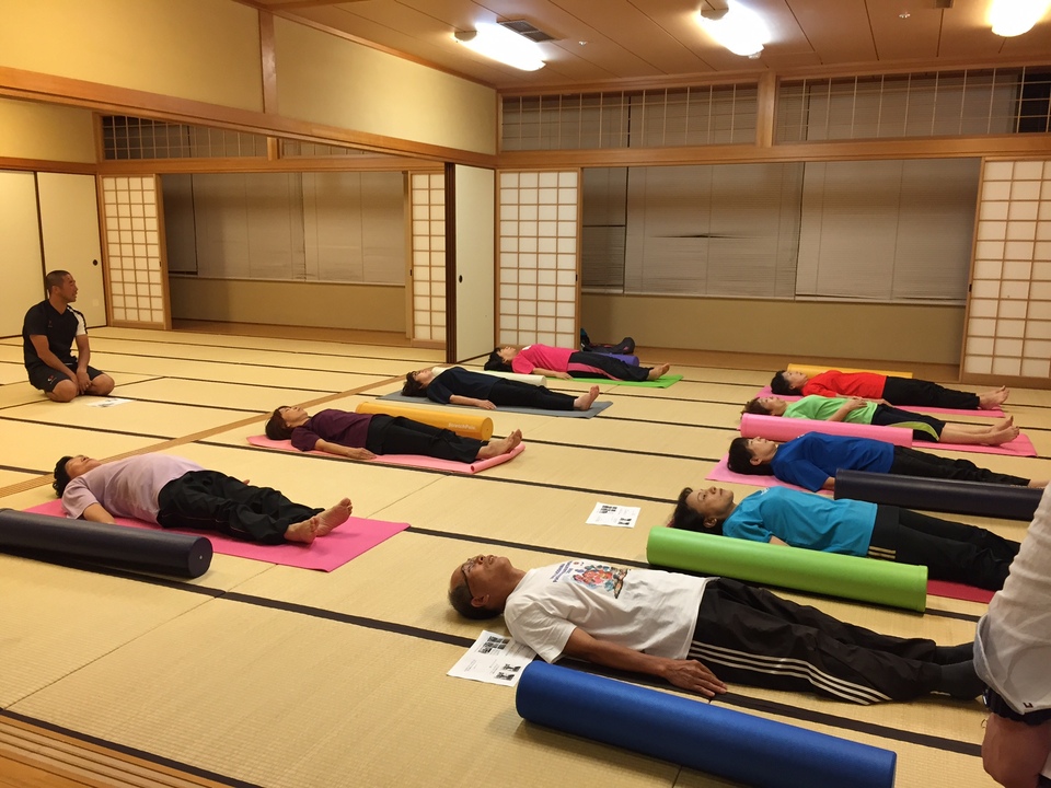 最初と最後に畳の上に寝ます。ストレッチポールに乗ると肩や背中の凝りがほぐれます。体操を行う前は、背中の一部分に空間があるのですが、体操後はなぜか背中が畳にべたっとつき、気持ちよくなります