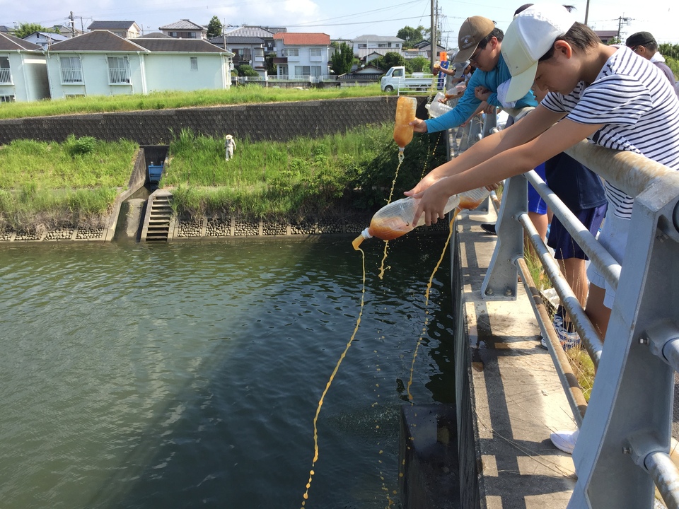 ◇広瀬小学校地域づくり協議会で作成した「EMだんご」や「EM活性液」を投入。川の水が浄化されるように毎年行っています。効果があるとかないとか色々議論はありますが、少しでも役に立てたらという思いと子どもたちに川の水質について興味をもってもらいたいという思いで活動を続けています